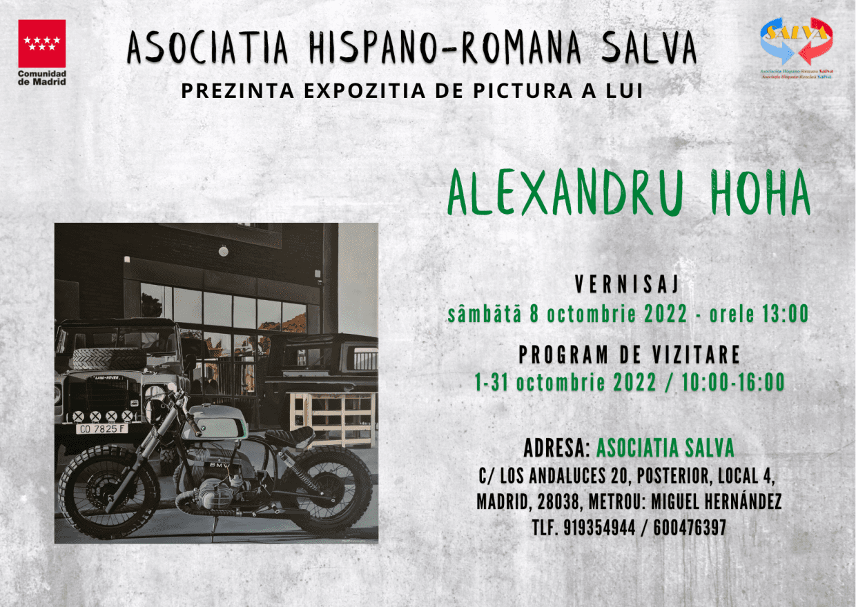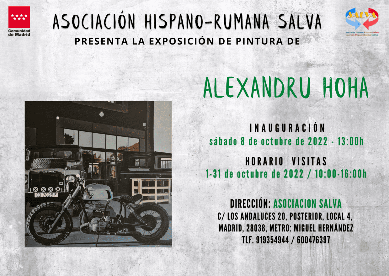 Su nombre es Alexandru Hoha y expondrá en la sede de nuestra asociación una serie de obras, entre las que podrás admirar retratos, coches y motos, ejecutados en un estilo muy personal, donde líneas perfectas, o casi perfectas se entrelazan con sombras que parecen reales. La inauguración de la exposición tendrá lugar el sábado 8 de octubre, a partir de las 13:00 horas, y la exposición se podrá visitar durante todo el mes de octubre, de lunes a viernes, entre las 10:00 y las 16:00 horas. ¡Te esperamos!