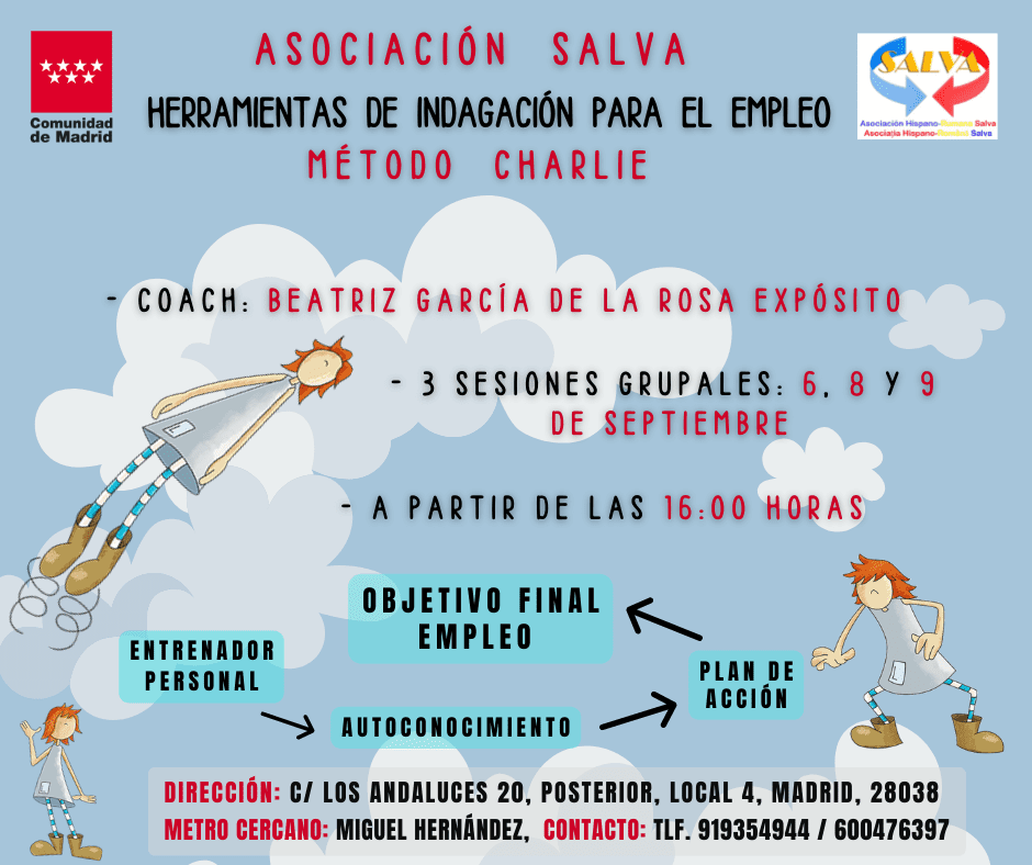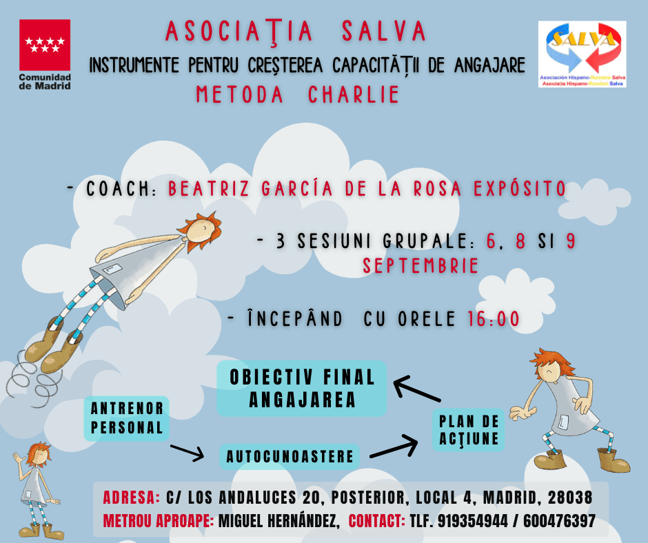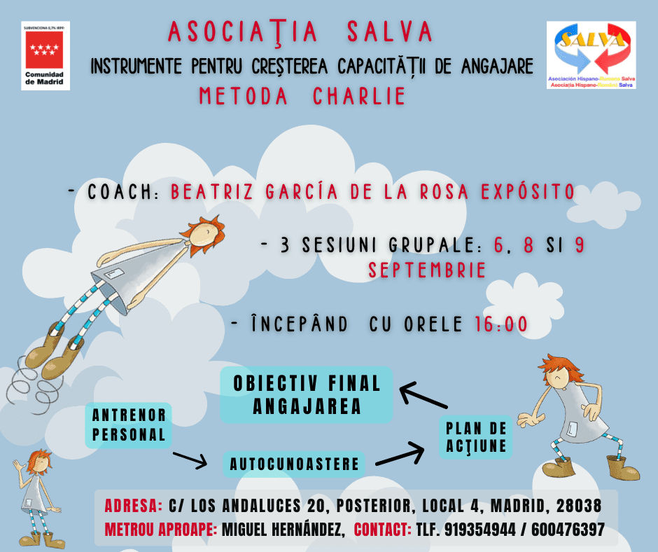 🇷🇴 Dragi prieteni, săptămâna viitoare la sediul Asociației Salva vom organiza o serie de 3 întâlniri grupale, unde fiecare participant va fi îndrumat catre o mai buna autocunoaștere si va fi ajutat sa își descopere drumul si schimbările necesare pentru ași atinge obiectivele personale. Întâlnirile vor fi conduse de catre Beatriz Garcia de la Rosa Expósito, expert în acompaniamentul proceselor de schimbare si creatoarea metodei Charlie. Întâlnirile vor avea loc de la orele 16:00, in zilele de marți, joi si vineri (6, 8 si 9 septembrie). Pentru înscrieri sau informații nu ezitați sa ne contactați!!!
