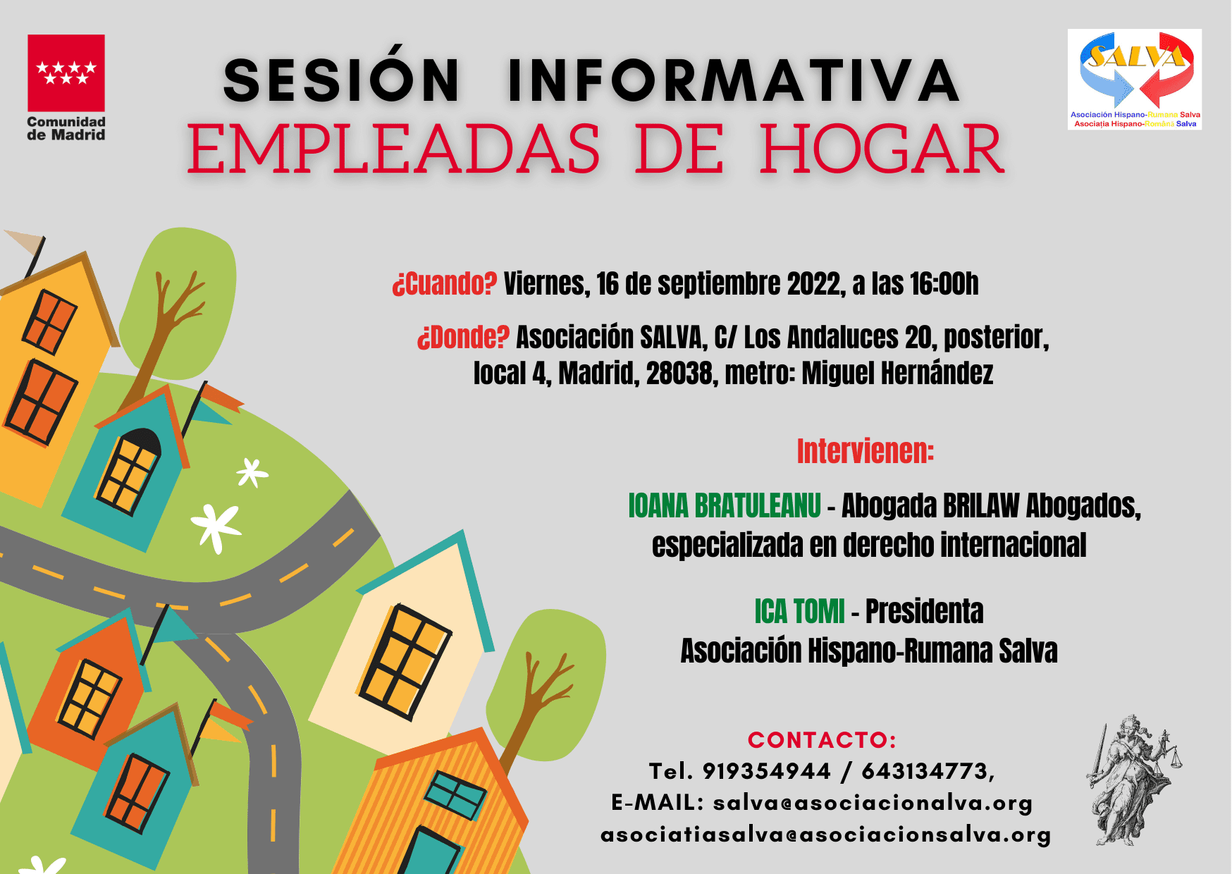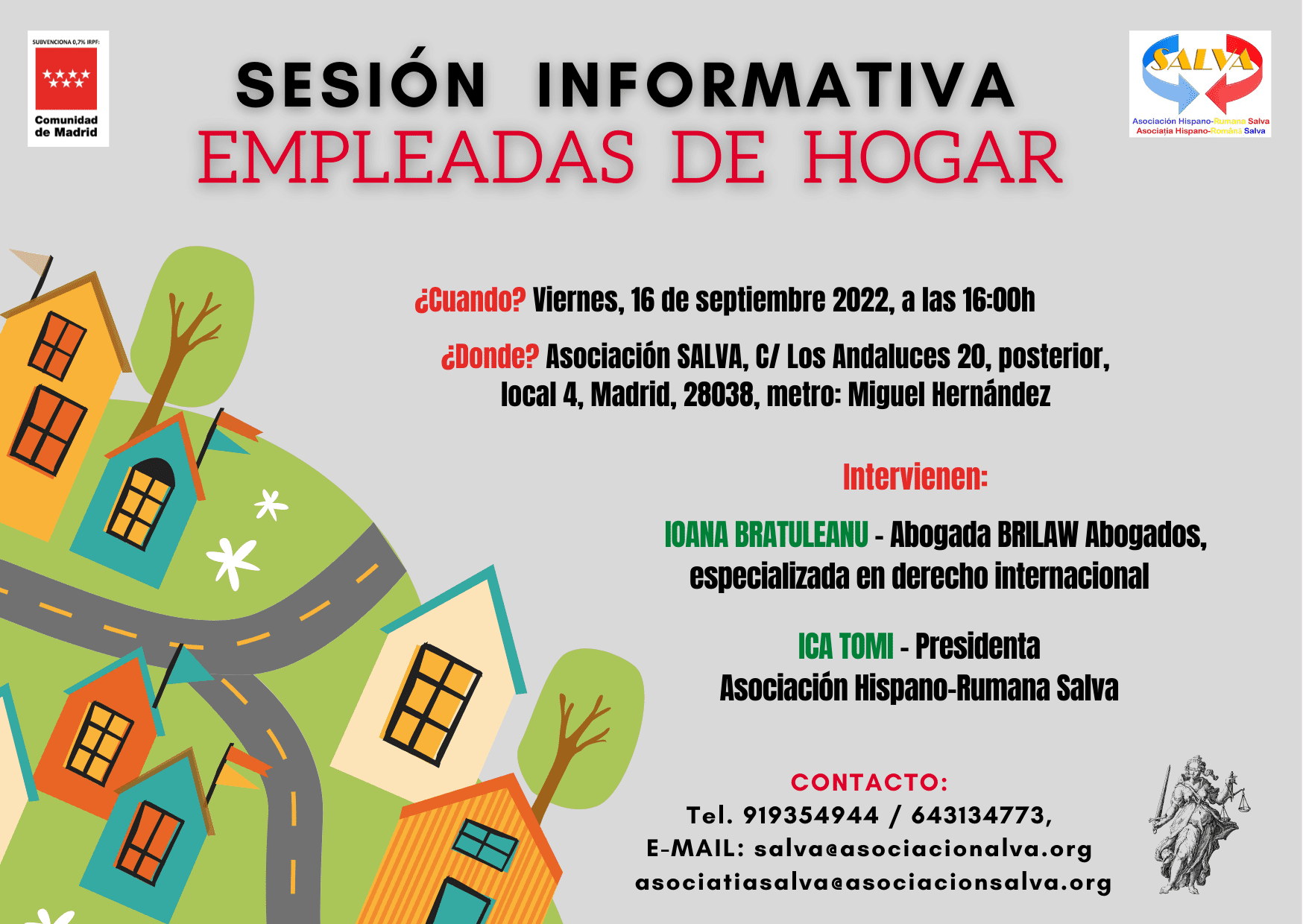 🔊 Dragi prieteni, in data de 16 septembrie, începând cu orele 16:00, vom organiza o noua sesiune informativa. De data aceasta vom vorbi despre angajații din serviciul domestic din Spania (EMPLEADAS DE HOGAR), si vom dezbate mai pe larg noutățile legate de aceasta categorie. Vor interveni, Dna. Ioana Bratuleanu (avocat Brilaw Abogados, specializata in drept internațional) si Dna Ica Tomi (președinta Asociației Hispano-Rumana Salva). Pregătiți-va întrebările pentru invitatele noastre, ne vedem pe 16 septembrie!