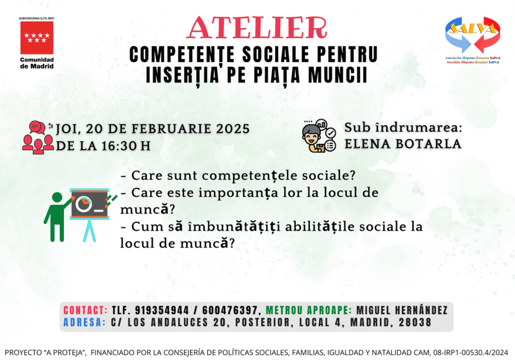 Asociația Hispano-Română Salva, prin proiectul A PROTEJA, organizează un nou atelier de formare în competențe sociale, destinat migranților aflați în situații de vulnerabilitate, cu un accent special pe comunitatea romă din Comunitatea Madrid.