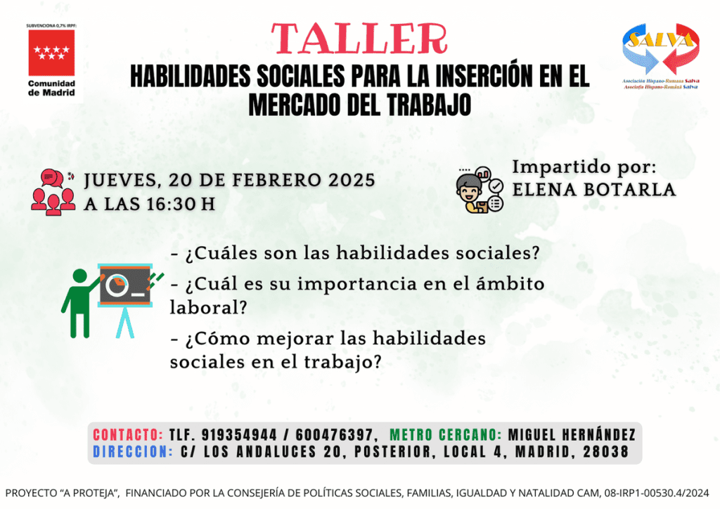 La Asociación Hispano Rumana Salva, a través del proyecto A PROTEJA, organiza un nuevo taller de capacitación en habilidades sociales, dirigido a personas migrantes en situación de vulnerabilidad, con especial atención a la comunidad gitana romaní en la Comunidad de Madrid.