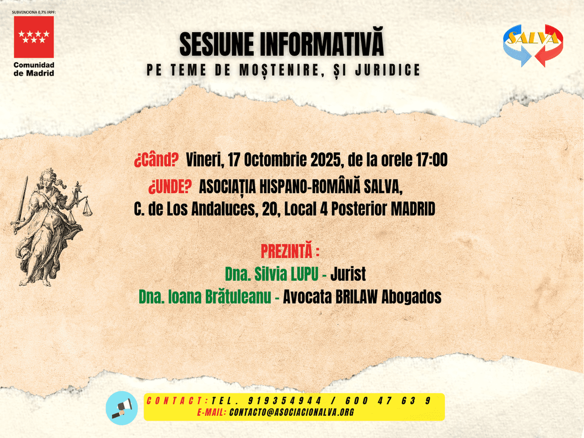 🏛️ Sesión Informativa: Herencias y Asuntos Jurídicos para Rumanos Residentes en España 📅 Cuándo: Viernes, 17 de octubre de 2025, a las 17:00 horas📍 Dónde: Asociación Hispano-Rumana SALVACalle de Los Andaluces, 20, local 4 posterior — Madrid La Asociación Hispano-Rumana SALVA organiza una sesión informativa gratuita dedicada a los rumanos residentes en España […]