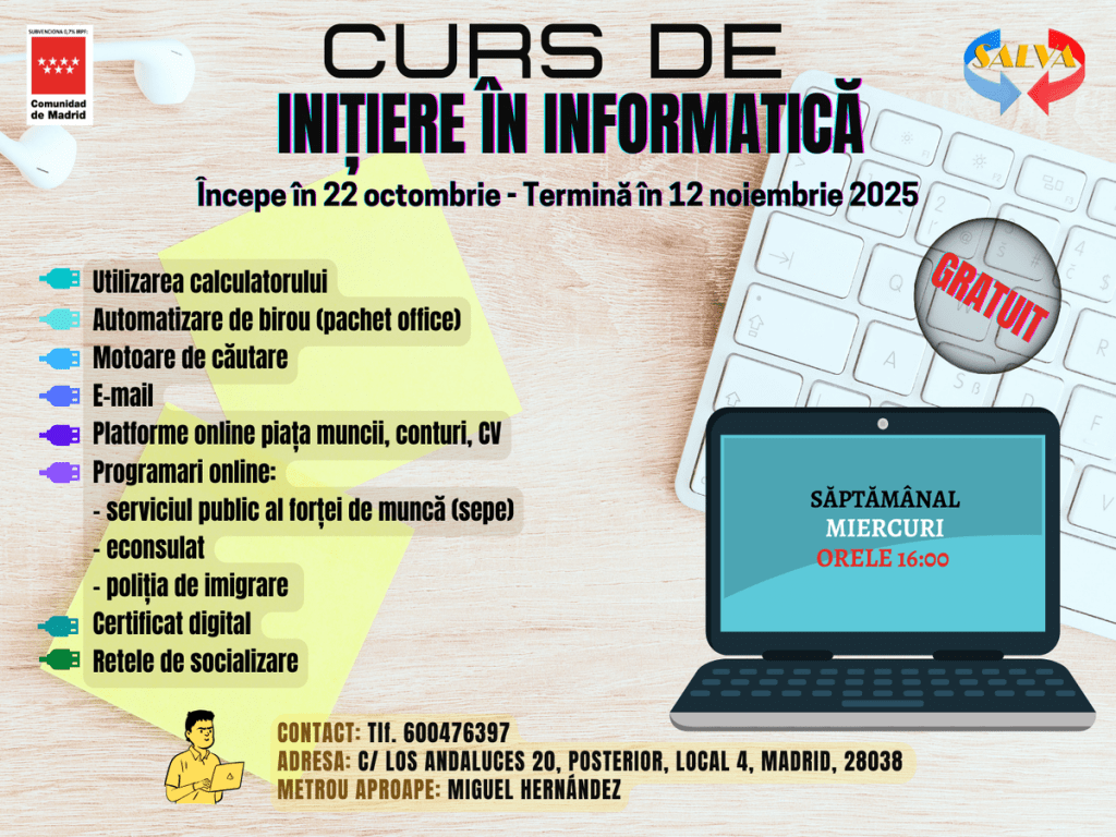 Pe data de 12 noiembrie 2025, a avut loc ultima sesiune a ediției din acest an a Cursului Gratuit „Inițiere în Informatică”, o inițiativă educațională menită să ofere competențe digitale de bază persoanelor aflate în căutarea unui loc de muncă.