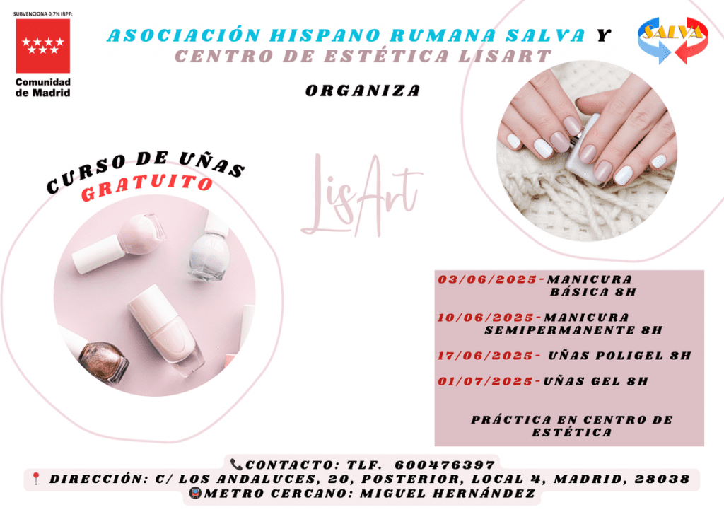LEE MASCurso de manicura y pedicura estética – 03.06.2025 Realizado con éxito el 3 de junio La Asociación Hispano Rumana SALVA llevó a cabo con éxito, el pasado 3 de […]